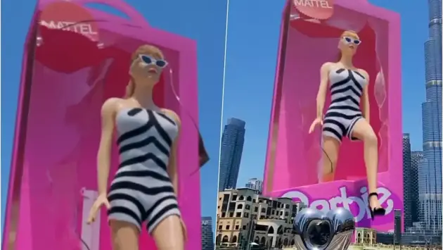 В ролике гигантская Барби, облаченная в яркий полосатый комбинезон, белые солнцезащитные очки и стильные черные туфли на каблуках, эффектно выходит из огромной упаковки Mattel.