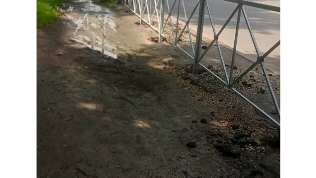 Асфальт испорчен, а тем, кто пожелает пройти по улице за ограждением, разделяющим пешеходную зону и проезжую часть, придется столкнуться с бездорожьем.