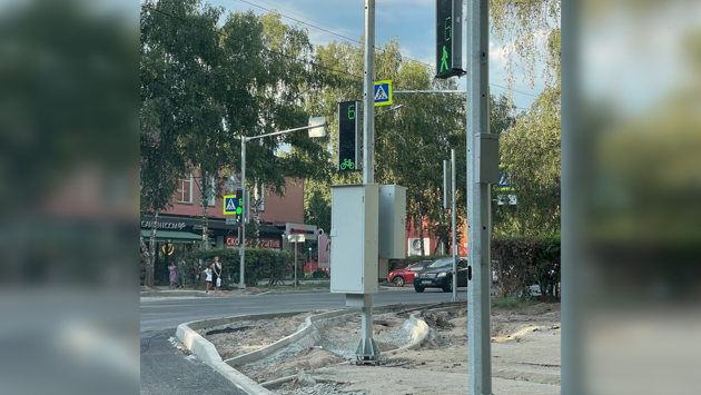 На опубликованном снимке видно, что на перекрёстке, где продолжаются работы по благоустройству, установлен столб, на котором размещен светофор с изображением велосипеда. А в нескольких метрах от него можно увидеть ещё один столб со светофором, на котором изображён пешеход.