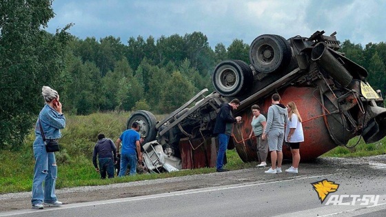 На трассе под Новосибирском перевернулся автобетоносмеситель
