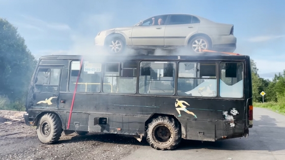 Теперь он стал необычным эвакуатором для старенького седана Chevrolet Evanda. Автомобиль поместили на крышу автобуса, устроив там эффектный бернаут, а затем и вовсе «уронили» в салон автобуса. Прямо вместе с крышей.