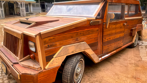 В процессе кастомизации Ford F-150 лишили всех панелей кузова, место которых заняли деревянные доски. Из строительного материала владелец изготовил крышу, двери, бамперы, а также радиаторную решетку и капот с воздухозаборником. На крыше самодельного автомобиля появилась стеклянная зона, а на боковых окнах – москитные сетки.
