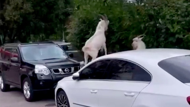 Судя по видео, один из соперников забрался на капот припаркованной легковушки и не позволял другому козлу занять его территорию.
