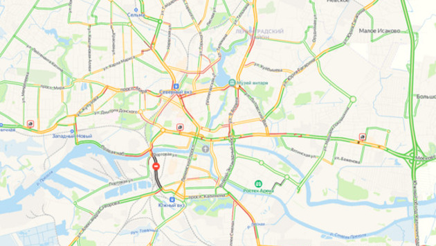 Одно ДТП на Моспроспекте произошло в левом ряду у пересечения с Мариупольской, и второе — в правом ряду у ТЦ «Гиант». Небольшие заторы сформировались у остановки «Улица Грига» и у ТЦ «Сити». Проспект Мира «красный» от драмтеатра до «Европы», Ленинский — от КГТУ до «Калининград-Плазы».