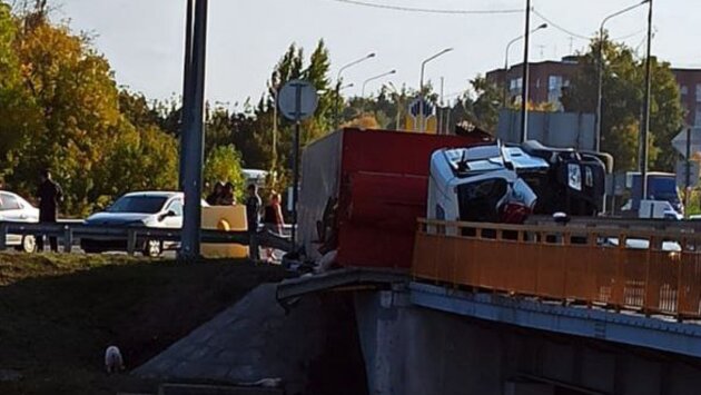 Водитель большегруза не справился с управлением. Автомобиль опрокинулся, упав на отбойник.