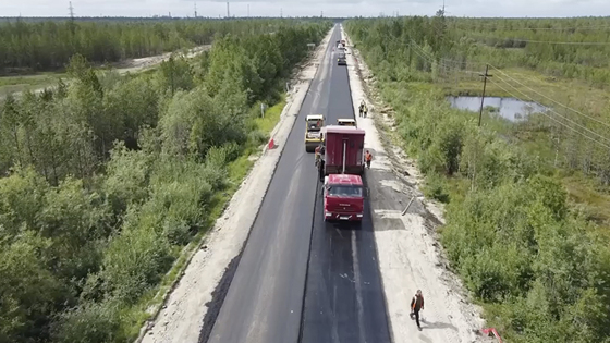 Рабочие завершают укладку асфальта на дороге Ноябрьск – Вынгапуровский. ВИДЕО