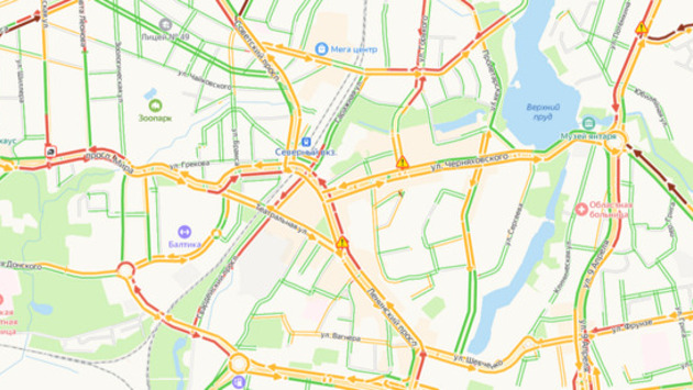 Стоят подъезды к площади Василевского со стороны Литовского Вала, 9 Апреля и Невского — там «красным» отмечены также прилегающие участки Кубышева, Дадаева и Некрасова. Пробка на Высоком мосту и на Дзержинского от Фридландских ворот до Днепропетровской. В районе равелина Фридланд стоит проспект Калинина. Затор по обе стороны двухъярусного моста. На пересечении проспекта Мира и Комсомольской произошло ДТП — пробка тянется до до художественной школы.