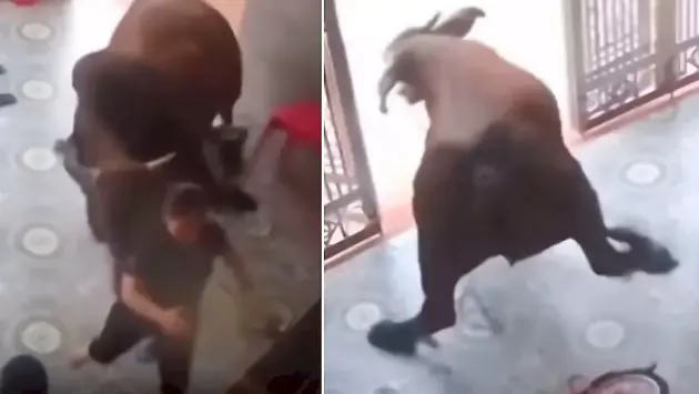 Бык прервал прогулку и загнал в жилище вьетнамское семейство - видео