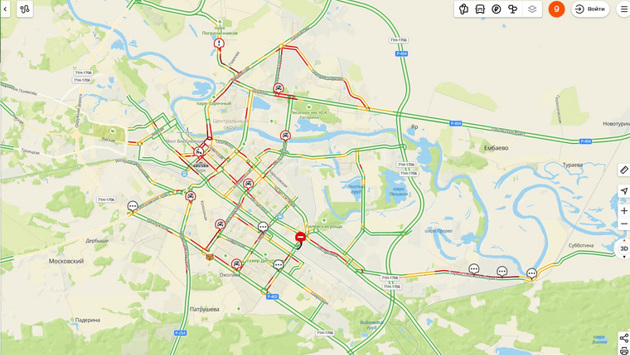 Центральные улицы города сковали вечерние пробки. Сервис 2ГИС оценивает дорожные заторы на девять баллов из 10.