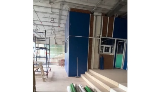 Специалисты обновили лестницу на входе и пост охраны. Внутри здания также проведен ремонт: обновлены полы и стены, установлены лифты. Впереди — монтаж потолка и отделочные работы.