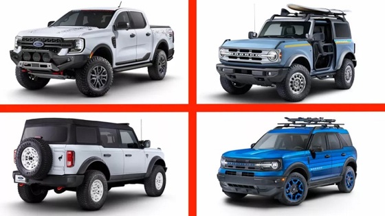 Bronco Sport Blue Free Wheeling — это синяя версия Bronco Sport Free Wheeling Edition. Вместо традиционных красных, оранжевых и желтых полос используются различные оттенки синего. Помимо боковой графики, на решетке радиатора и колесах присутствуют синие акценты. Изменения продолжаются внутри с синей отделкой и разноцветными тканевыми сиденьями. Форд заявил, что модель демонстрирует «колоссальные изменения... владельцы могут внести в свои автомобили с помощью программы персонализации аксессуаров». Что касается пикапов, то бренд выпустил пакет ORV для Ranger XLT и Lariat 2024 года с полным приводом. Он добавляет комплект подвески ARB Overland, а также мощные бамперы ARB. Модель может быть оснащена такими опциями, как фары SOLIS, бортовой воздушный компрессор и холодильник.
