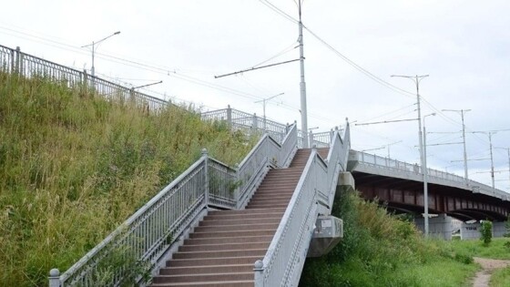 Часть пешеходной зоны моста обвалилась в июне этого года. Спуск с моста в связи с опасностью для пешеходов был перекрыт. Сейчас лестницу начали ремонтировать.