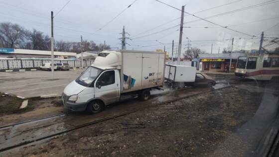 В Саратове застрявший в грязи на рельсах автомобиль остановил движение трамваев