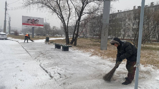 Рабочие очищали автобусные остановки и подходы к пешеходным переходам на улицах 50 лет Октября, Театральной. Заметание тротуаров провели на Театральной, Горького, включая аллею.