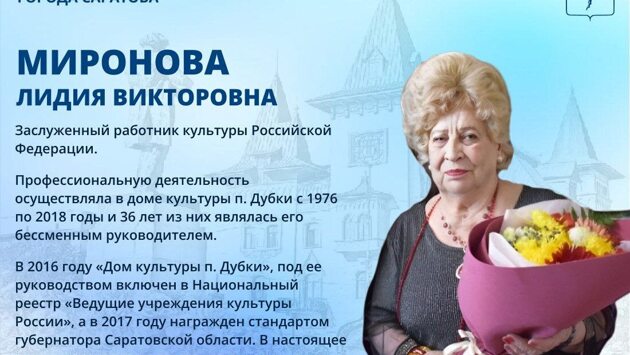 Сегодня, 29 ноября, день рождения отмечает Почетный гражданин города Саратова Лидия Миронова. Поздравление Почетному гражданину Саратова направила мэр Саратова Лада Мокроусова. -В этот праздничный день примите слова искренней благодарности за то наследие, которое Вы передали своим преемникам и продолжателям, за популяризацию народного творчества. От всей души желаю Вам крепкого здоровья, счастья, благополучия, неиссякаемого оптимизма и жизнелюбия!- отметила глава города.