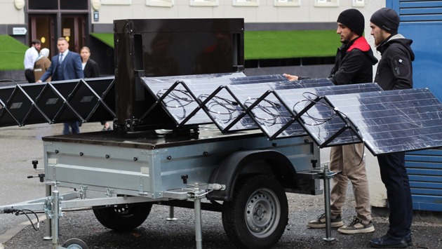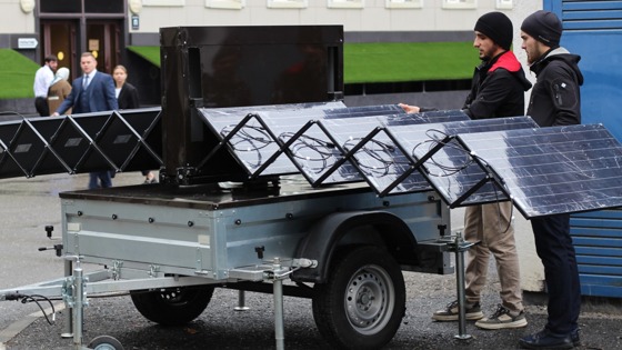 — Станция представляет собой автомобильный прицеп, на котором закреплены 10 солнечных панелей и установлен каркас с аккумуляторами, инвертором, проводкой и «мозгами» устройства, — рассказывает Мовсар. — Блок управления и розетки находятся сбоку на прицепе. К станции можно подключать все что угодно: телевизор, микроволновку, зарядники, свет.