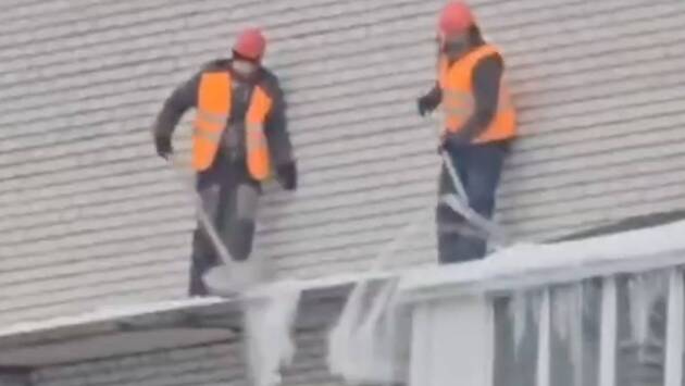 На видео показано, как двое коммунальщиков идут по крыше лоджии и по примыкающему к ней козырьку, держа в руках лопаты. Они счищают с поверхности снег, а также сбивают с крыши сосульки. Отмечается, что дворники перемещаются на уровне шестого этажа в расположенном на Новоизмайловском проспекте многоквартирного дома.