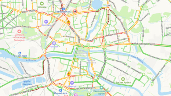Движение затруднено на основных магистралях, в том числе на Правой набережной, Железнодорожной, Суворова, Камской, Киевской, Дзержинского, Аллее Смелых. Красным также отмечены Московский проспект, Литовский вал, Фрунзе.
