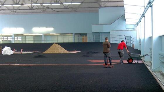 Новая компания завершит ремонт покрытия и проведёт дополнительные монтажные и строительные работы. Сейчас специалисты обустраивают нижние слои монолитного покрытия, а далее нанесут верхний слой — декоративный. В обновлённом здании собираются проводить легкоатлетические соревнования и тренировки.