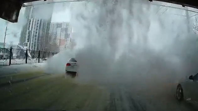 «Это было круто…» - комментирует водитель. Судя по кадрам, с пешеходного перехода на машины свалился снег. Всё произошло утром в пятницу, 15 декабря.