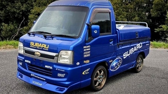 Перед нами крошечный грузовичок кей-класса Subaru Sambar 2007 года выпуска, который получил спортивный обвес и ливрею, выполненную в стилистике окраски оригинальных раллийных Subaru Imreza.