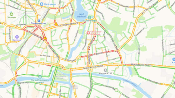 Красным отмечены центральные улицы: проспект Мира от театра до КГТУ, Ленпроспект от администрации до Родины-Матери, Театральная и Гвардейский проспект около «Европы». Сообщается о ДТП и возникшей из-за него пробке на Невского возле церкви Святого Адальберта. Авария случилась на Московском проспекте у «Чеховки», и ещё одна — на Гурьевском шоссе, недалеко от старого кладбища. Из-за ДТП у Восточного пруда собралась пробка на улице Дзержинского.