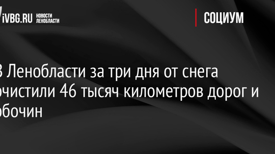 За минувшие три дня в Ленобласти от снега и наледи очистили около 46 тысяч километров дорог и обочин. Видео: t.me/dorogi_47 В ближайшие дни Ленобласть снова ждет непогода. Во всех районах региона ожидается метель, стабильная минусовая температура, сильный ветер и гололедица. Холоднее всего будет в Тихвине и Бокситогорске. Напомним, обращения по уборке снега принимает снежный штаб в группе во ВКонтакте. В регионе для водителей также открыта круглосуточная «горячая» линия по ситуации на региональных дорогах — 8(812) 660-46-47. На связи также оперативный дорожный Телеграмм-канал.