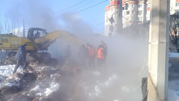 На месте аварии сейчас находятся девять единиц техники и 11 рабочих. Аварийный участок временно выведен из системы теплоснабжения. Порядка 25 адресов запитываются по резервной схеме.