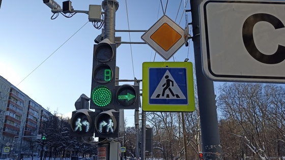 Поворотная «стрелка» остается включенной и во время перехода пешеходов через улицу Ошарскую. Согласно ПДД, водители должны пропустить их при повороте направо. Для напоминания об этом на светофорном объекте установили дополнительные информационные секции с белыми человечками и стрелками.