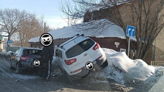 Фото размещены в группе автомобилистов в соцсети «Вконтакте». На них виден взлетевший на сугроб по правой стороне дороги белый автомобиль Kia. Рядом стоит темный Citroen.