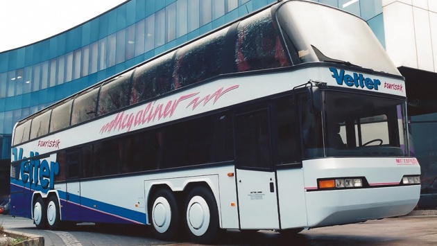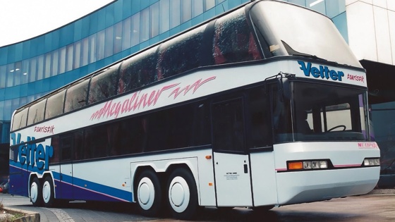 Главным достоинством «Мегалайнера» были исполинские размеры. Длина составляла 15 метров, высота — четыре, ширина — 2,5 метра. Места тут было столько, что очень часто в задней части салона делали кухню с барной стойкой. Ну а поскольку это были дальнемагистральные автобусы, то их оснащали и туалетами, причем на обоих этажах. Кресла же можно было ставить как душе угодно: напротив друг друга или в один ряд с широким центральным проходом. Стандартно автобусы комплектовалил пневмоподвеской, толстыми стеклами, снижающими шум во время движения до 15 децибел, АБС и антибуксом.