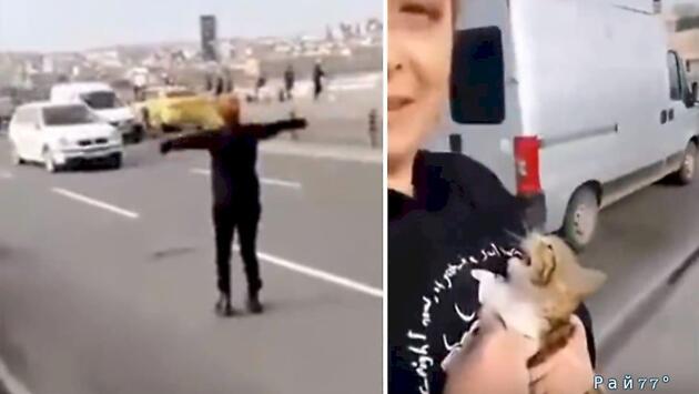Женщина, рискуя жизнью, остановила движение транспорта и спасла котёнка: видео