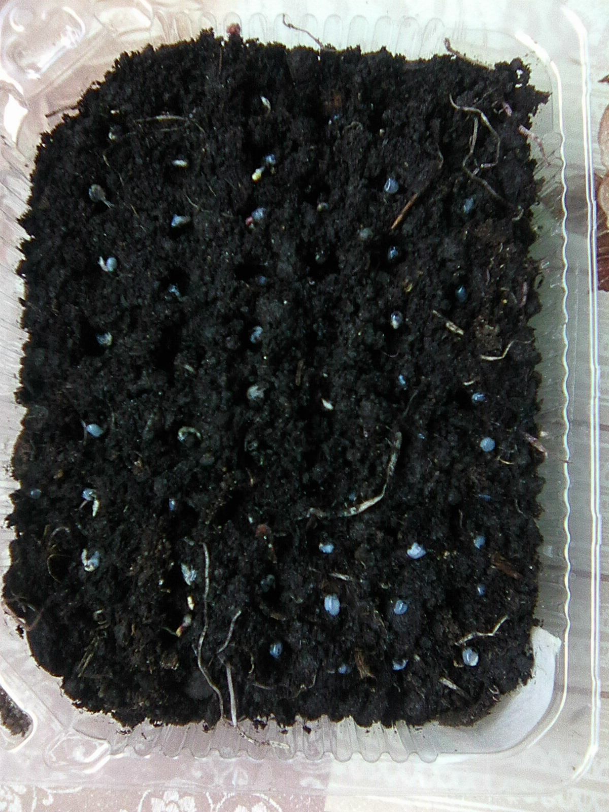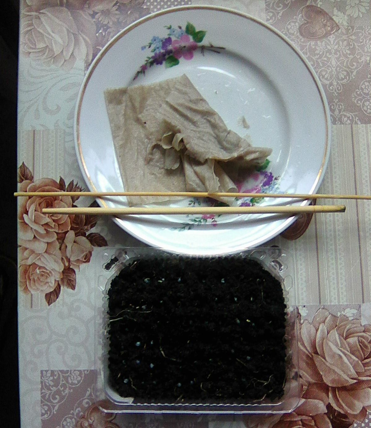 Грунт насыпала в прозрачную плошечку с крышечкой, разровняла его поверхность, смочила и слегка уплотнила, затем деревянной палочкой сделала углубления 5 мм. В эти ямочки разложила семена. При раскладывании семян можно пользоваться пинцетом или шпажкой. Поддеть ими семечко с бумаги очень просто, а вот положить его на почву с разбега не получится — семена покрыты очень клейкой массой и не хотят отставать от кончиков инструментов. Чтобы они легко отставали, нужно предварительно хорошо смочить бумагу, на которой проращивались семена. А если корешок семечка вырос настолько, что застрял в бумаге, в этом нет ничего страшного — можно отделить проросток вместе с кусочком бумаги и так положить на землю.