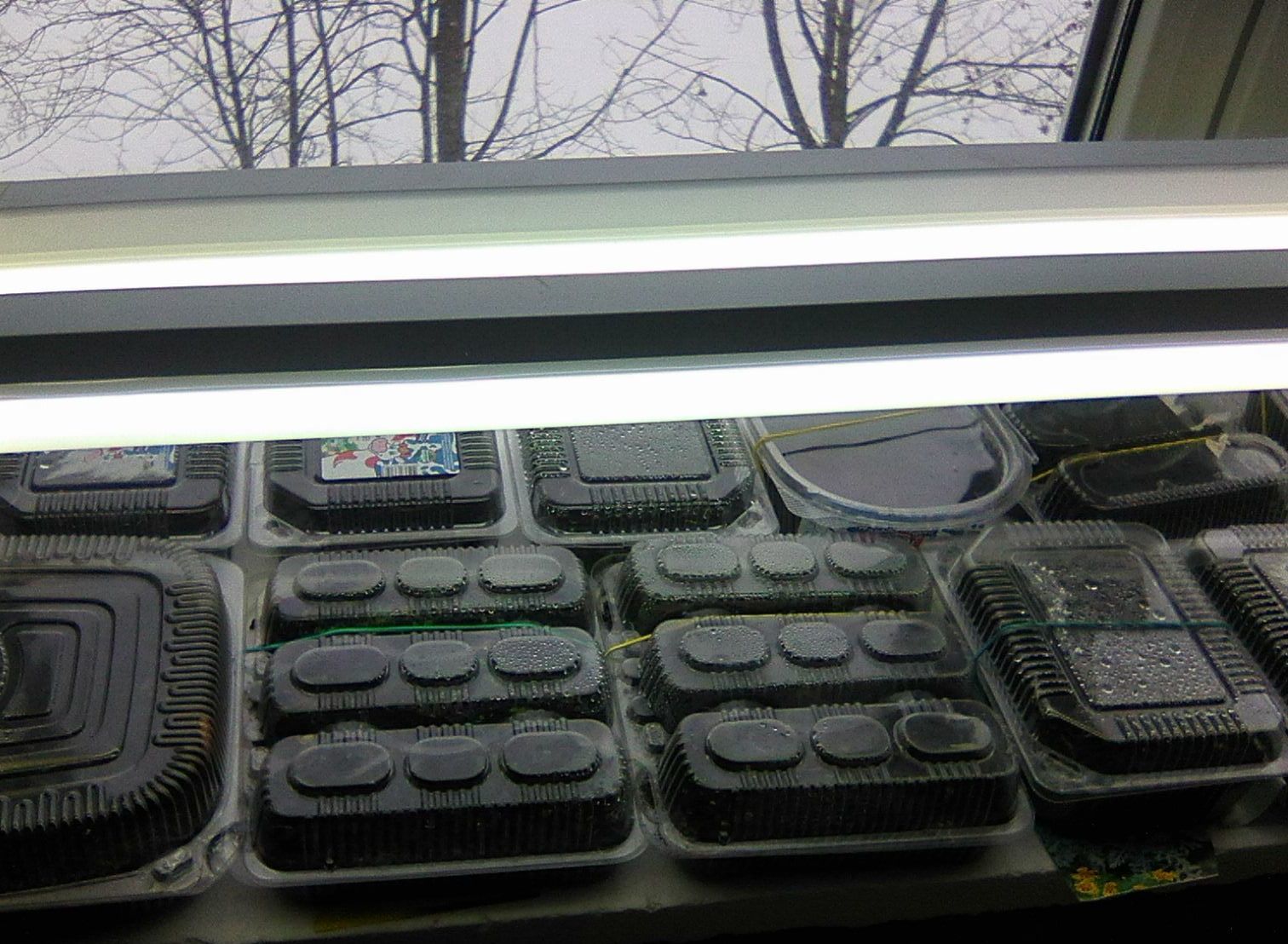 А теперь помещаю плошечку в «рассадник» — на светлый подоконник с дополнительным освещением к остальным будущим растениям. А они уже начали просыпаться — взошли агератум, целозия и лаванда.