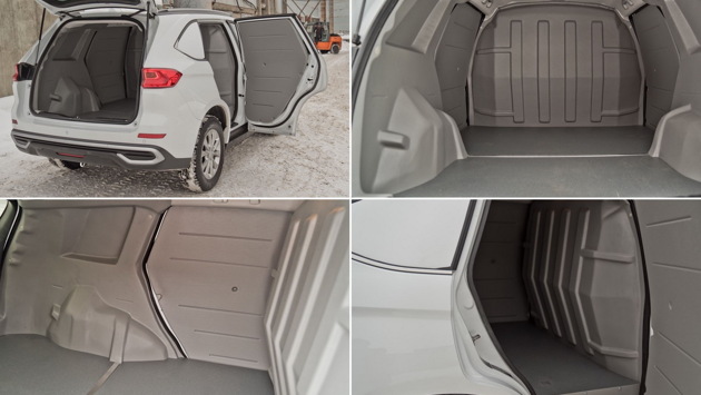 Грузовой Haval M6 достаточно вместительный: объём кузова — около 2,3 кубометра, глубина отсека — 1,8 метра, ширина на уровне задних дверей — 1,4 метра, высота — один метр. Важно, что доработки сертифицированы, то есть покупатель не лишится заводской гарантии. При этом у фургона остаются все опции исходного кроссовера: парктроники, климат- и круиз-контроль, светодиодные фары, камера заднего вида и медиасистема с 10,25-дюймовым тачскрином.