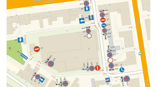 На месте будут установлены соответствующие знаки, запрещающие остановку и стоянку автомобилей со стороны улицы Ленина, Соборной и Почтовой.
