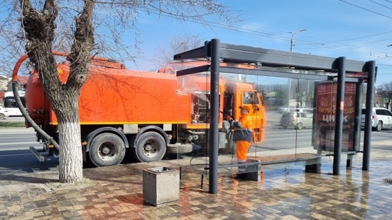 Павильоны на остановках общественного транспорта моют при помощи специальных установок, отметили в мэрии. Рабочие моют также лавочки, площадки ожидания и информационные табло. Рано по утрам и ночью бригады ведут влажную уборку прилотковой части дороги, отмывают от пыли дорожные знаки и ограждения.