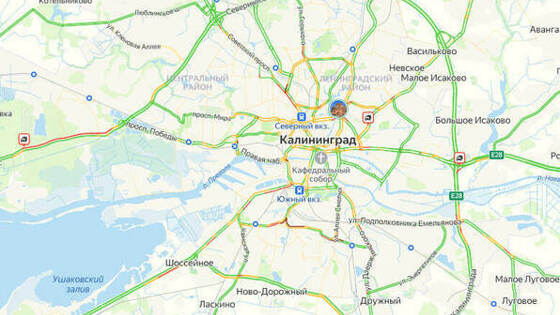 Улицы Калининграда утром в пятницу, 19 апреля, встали в пробках. Об этом свидетельствуют данные сервиса «Яндекс.Карты».