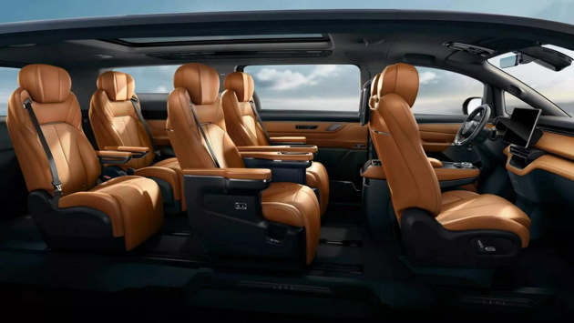 На демонстрационных снимках минивэн LEVC L380 шестиместный с мультиконтурными креслами всех рядов. Над головами пассажиров панорамная крыша площадью 2,18 квадратного метра, сиденья обтянуты полуанилиновой кожей, есть подставки для ног, электрорегулировки подушки и спинки, а также возможность продольного сдвига.