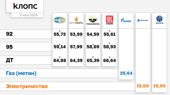 За последние две недели ценники на топливо изменили заправки сетей «Рос&Нефть», «Лукойл», «Сургутнефтегаз». Стоимость АИ-95 в Калининграде находится в коридоре 57,99—59,14 рубля за литр. Цена АИ-92 на крупных заправках колеблется в диапазоне 53,99—55,73 рублей за литр. Литр дизеля в среднем стоит от 64,39 до 66,64 рублей. Газ (метан) — 25,64 рубля. Заправка для электромобилей обойдётся в 15 рублей за кВт/ч.