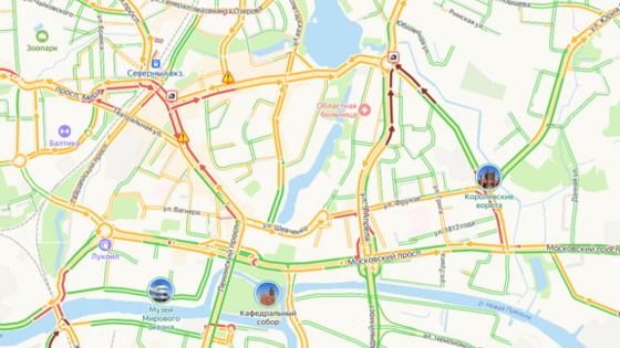 Днём в понедельник, 13 мая, Калининград встал в пятибалльных пробках. Об этом говорят данные сервиса «Яндекс.Карты».