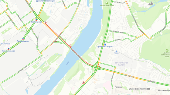 Движение транспорта затруднено на Мызинском мосту во вторник, 14 мая, при движении из Приокского в Ленинский район. Об этом свидетельствуют данные сервиса «Яндекс. Пробки».
