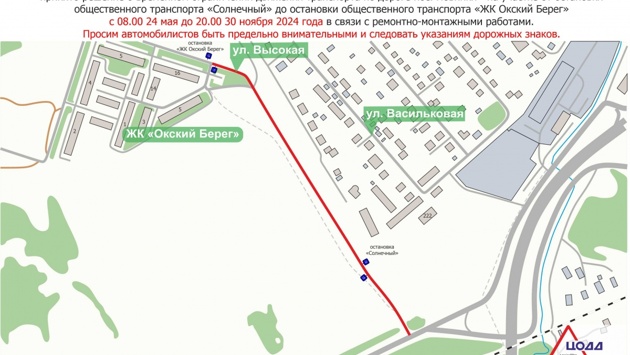 Из-за проведения ремонтных работ с 8:00 24 мая до 20:00 30 ноября участок проезда от остановки «Солнечный» до остановки «ЖК Окский берег» будет перекрыт. Объехать эту часть дороги можно по прилегающим улицам.