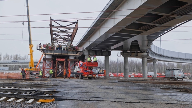 В Колпинском районе Петербурга в рамках реконструкции Петрозаводского шоссе завершилась надвижка металлоконструкций пролетного строения над железнодорожными путями.