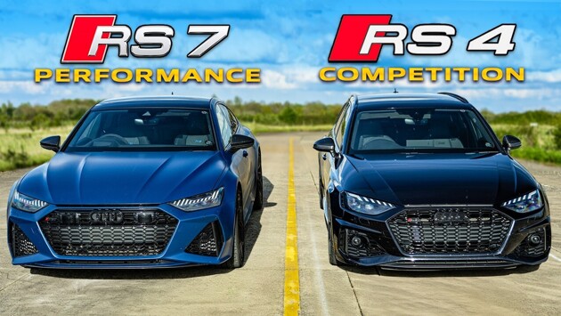Авторы YouTube-канала Carwow устроили очередную гонку по прямой, участниками которой стали два актуальных автомобиля Audi. Соперником лимитированного универсала Audi RS 4 Competition стал лифтбек Audi RS 7 Performance, причём заезд двух собратьев по бренду стал заодно ещё и состязанием двух концепций — более крупная модель в гонке участвовала в своём полностью стандартном виде, тогда как компактная машина получила небольшие доработки.