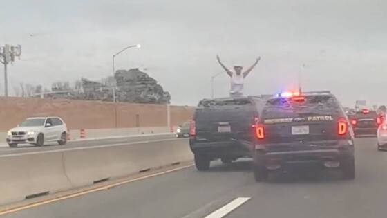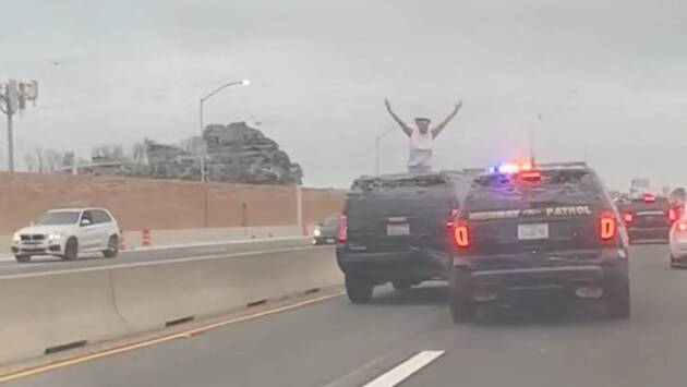 Через десять минут после начала преследования внедорожник остановился и его из люка на крышу выбралась женщина. Она встала в полный рост, повернулась лицом к полицейским и сняла с себя одежду. Женщина стояла абсолютно голой, раздвинув руки, пока ее не арестовали.