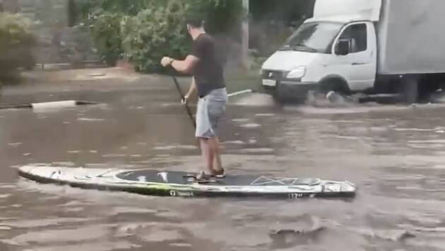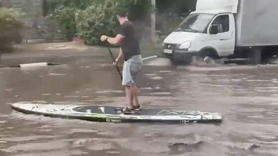 Плывущий на сапборде по затопленному городу россиянин попал на видео