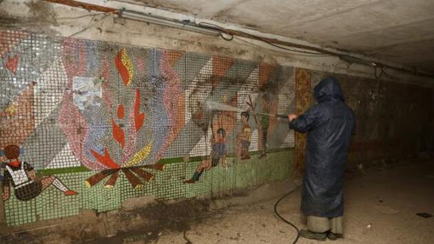 <p style="text-align:justify"><strong>В ходе подготовительных работ в подземном переходе на улице Черняховского рабочие обнаружили советскую мозаику. По просьбе горожан её решили сохранить. Так как полотно частично разрушилось, специалисты проводят архивные изыскания, которые позволят фрагментарно восстановить рисунок.</strong></p> <p style="text-align:justify">Сейчас подрядчик моет мозаику от грязи и пыли с помощью специального раствора. Очистка позволит оценить состояние сохранившейся мозаики и определить объём работ.</p> <p style="text-align:justify"><sup><sub>Фото: Влад Малышко</sub></sup></p>