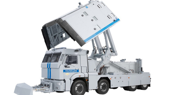 Отмечается, что комплекс включает в себя базовое шасси и установленное на него оборудование мобильного защитного комплекса, состоящего из ограждения, систем пожаротушения, видеонаблюдения и регистрирования, звукового и светового воздействия.