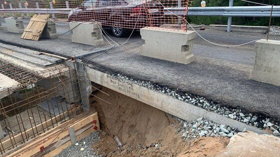 Реверсивное движение транспорта переключили на отремонтированную правую сторону и приступили к ремонту левой половины моста. Всего в плане отремонтировать 45,9 погонных метров сооружения.